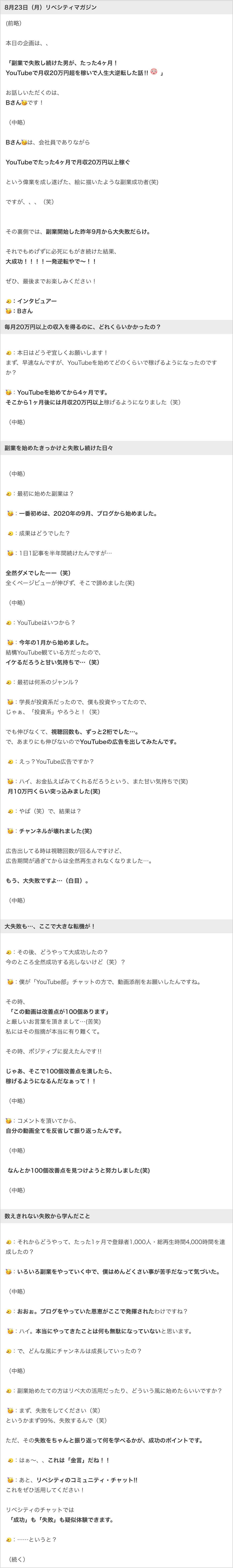 また、これまでに配信されてきたリベシティ会員の成功体験談などを読むことで「あなたの人生を好転させるヒント」を得ることができるかもしれません。
