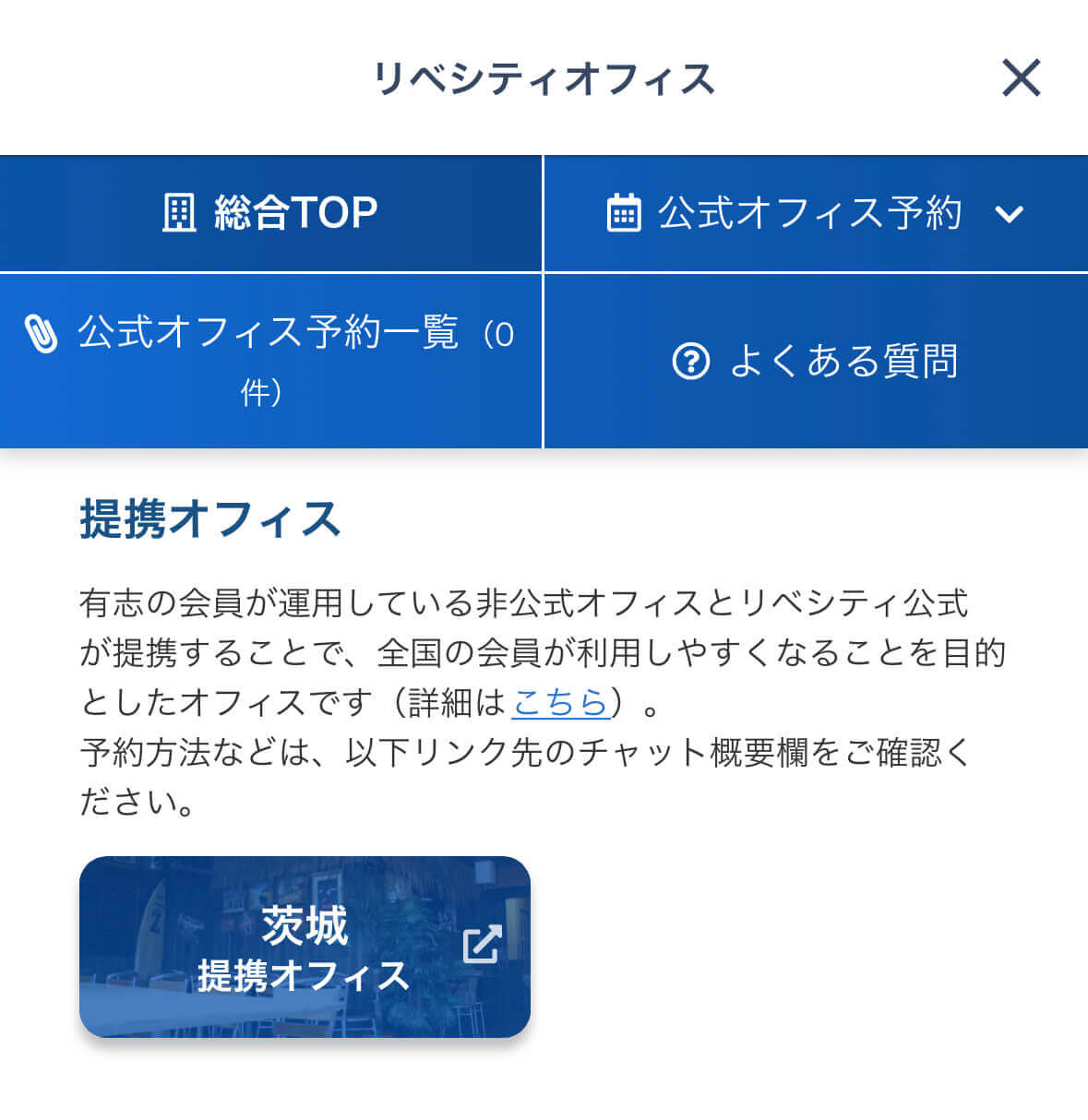 チャット検索からチャットに参加する方法以外にも、リベシティオフィス予約ページから各専用チャットに移動することができます。