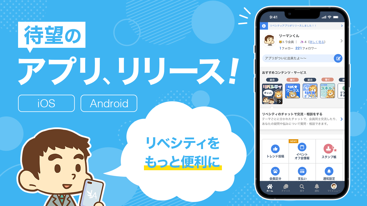 あなた宛のメッセージが届いた時にプッシュ通知が届くことや、欲しい情報にアクセスしやすいデザインなど、アプリがリリースされたことで更にリベシティを活用しやすくなりました!