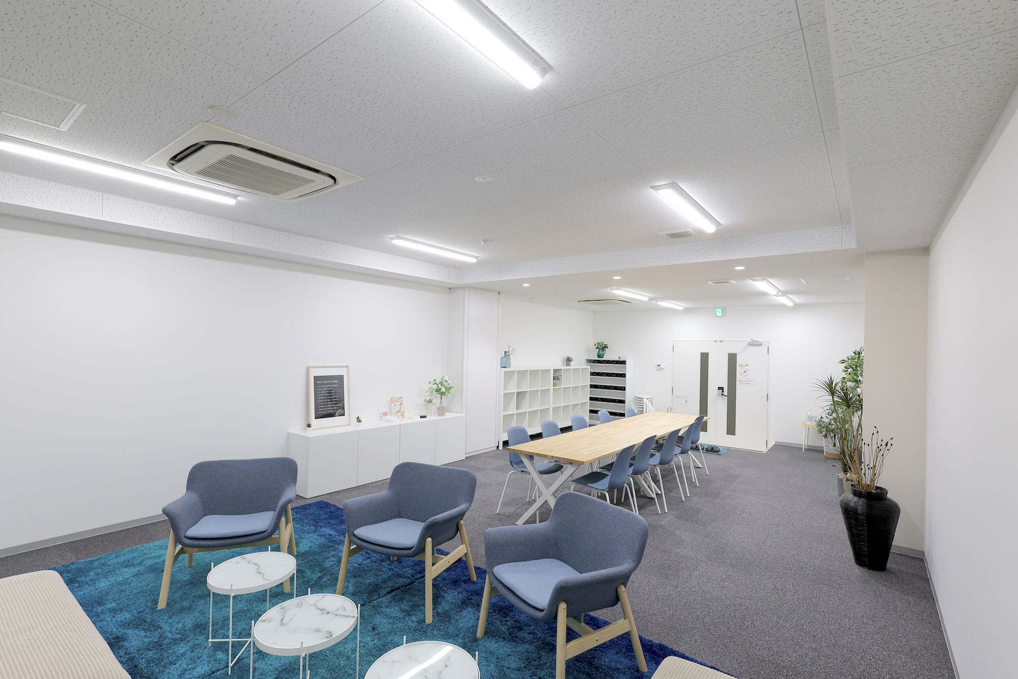 雪をイメージした青と白の家具をメインにデザインされた空間です。