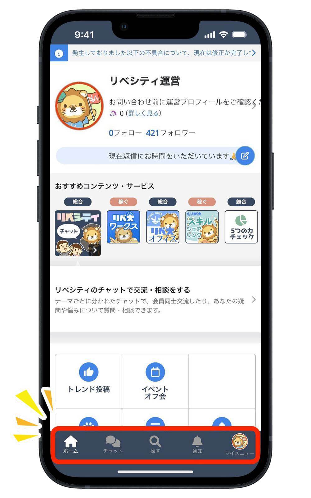 アプリならではのユーザーインターフェースとして、よく使う「チャット」「通知」「探す」などのメニューは画面下部に配置されています。